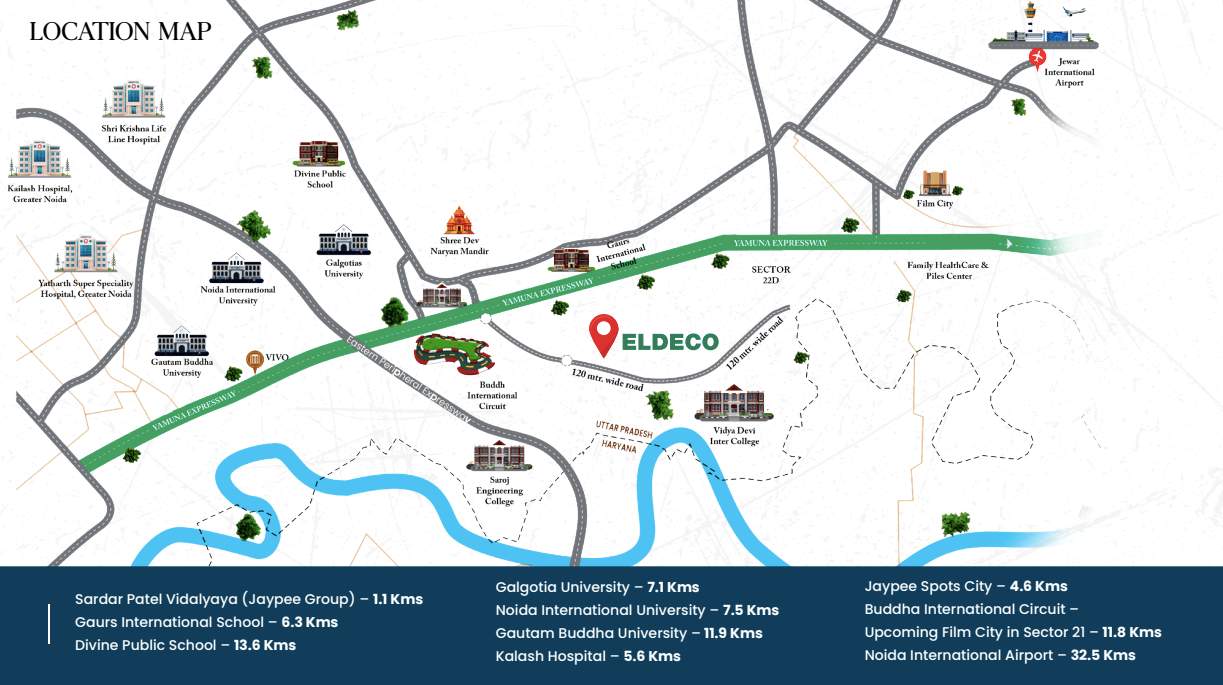 Eldeco Wow – Sector 22D, Yamuna Expressway Eldeco Wow is a premium residential development offering luxurious air-conditioned 3 BHK homes designed for elegance, comfort, and exclusivity. Spread across 5 acres with just 3 towers, the project ensures low density and ample open spaces, giving residents a serene and private living experience. Every home is thoughtfully crafted with corner-unit layouts, private balconies in every bedroom, VRF air-conditioning, lavish utility spaces, and a grand arrival experience with a water feature. Located at Sector-22D, Yamuna Expressway, this address is a hub of growth and connectivity. The expressway seamlessly connects Delhi, Noida, Greater Noida, Mathura, and Agra while linking to the DMIC Corridor, KMP Expressway, and the upcoming Palwal–Khurja Expressway. With government-backed infrastructure including industrial hubs, logistics parks, film city, EV parks, educational institutes, and tech zones, this region is emerging as NCR’s most promising growth corridor. Adding to its potential, the Noida International Airport (Jewar), set to become India and Asia’s largest, will further boost connectivity and value appreciation. Eldeco Wow is designed not just for comfort but for lifestyle. The project offers a curated mix of modern amenities including a festival garden, open gym, palm tree avenue, amphitheatre, multipurpose court, kids’ play area, and CCTV-powered security. Residents also enjoy an exclusive clubhouse with a double-height multipurpose hall, swimming pool, squash court, mini football court, box cricket, pool table room, gym, and kid play zones – ensuring wellness, leisure, and entertainment for all age groups. With wide sector roads, excellent infrastructure, and green surroundings, Eldeco Wow is not just a home – it’s a lifestyle upgrade at NCR’s most promising destination.