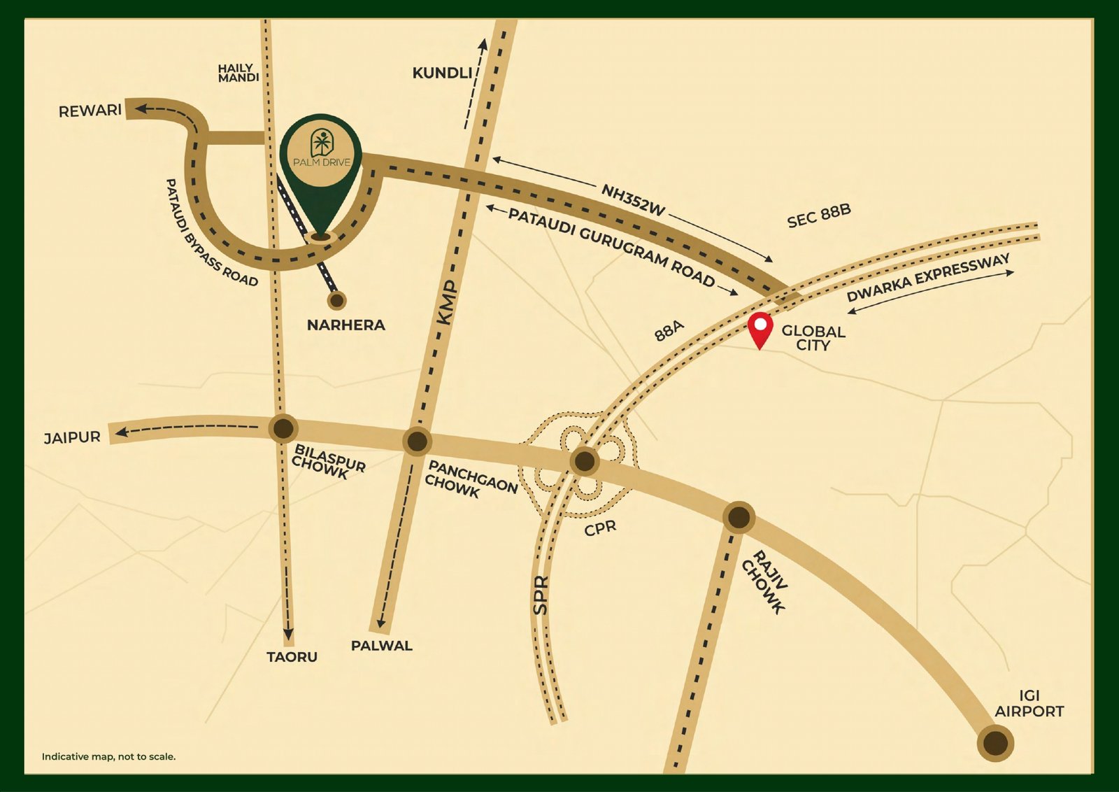 Project Summary: Palm Drive, Sector 3, Pataudi (Gurugram) This project—Palm Drive by VKS Developers—is part of the Haryana government's DDJAY scheme and offers residential plots in Sector 3, Pataudi, Gurugram. Highlights include: Prime Location & Connectivity Adjacent to NH‑352W Only about 3 minutes from KMP Expressway Roughly 10 minutes to NH‑8 (Bilaspur) Around 15 minutes to Dwarka Expressway.