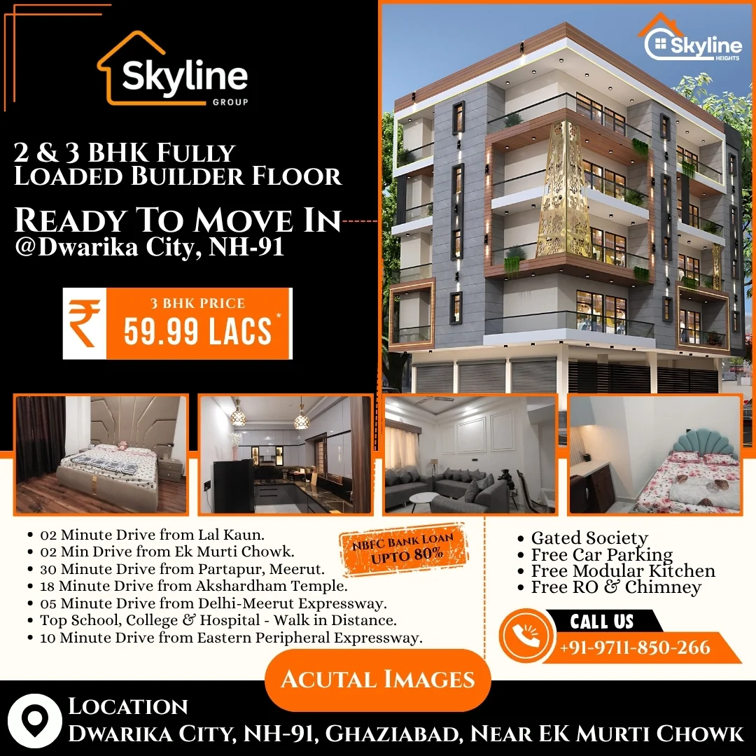 🏡 Skyline Heights – Premium Builder Floors @ Dwarika City, NH-91, Ghaziabad Ready-to-Move 2 & 3 BHK Fully Loaded Builder Floors now available in the prime location of Dwarika City, NH-91. Enjoy luxurious living with modern amenities, excellent connectivity, and peaceful surroundings. 💰 3 BHK Starting Price: ₹59.99 Lacs* 🏠 Loan Facility: Up to 80% NBFC Bank Loan Available 📍 Location: Near Ek Murti Chowk, Dwarika City, NH-91, Ghaziabad ✅ Property Highlights: 2 & 3 BHK Spacious Units Fully Loaded Floors with Premium Finishes Modular Kitchen with RO & Chimney Gated Society with Free Car Parking Top Schools, Colleges, and Hospitals within Walking Distance 🚗 Excellent Connectivity: 02 Min from Lal Kaun & Ek Murti Chowk 05 Min from Delhi-Meerut Expressway 10 Min from Eastern Peripheral Expressway 18 Min from Akshardham Temple 30 Min from Partapur, Meerut 📸 Actual Images Attached – No Sample Flats! 📞 Call Now for Site Visit & Booking: +91-9711-850-266 Own Your Dream Home at Skyline Heights – Where Comfort Meets Convenience!