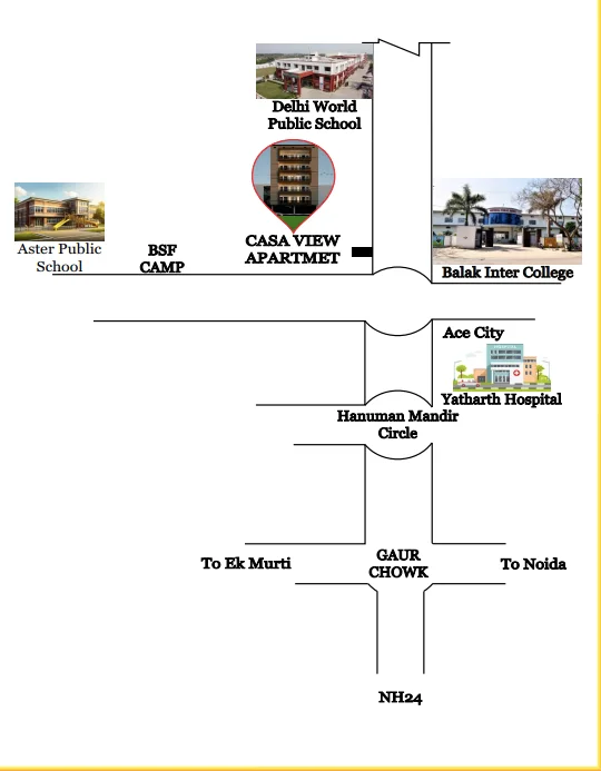 Casa View Apartments offers a luxurious living experience in the heart of Noida Extension. Nestled in Knowledge Park V, Chauganpur, these 2 and 3 BHK apartments redefine modern living with a perfect blend of contemporary architecture and tranquil surroundings. Our vision at Casa View is to create more than just homes; we aim to craft a community where luxury meets convenience. Each apartment is thoughtfully designed to reflect your lifestyle, providing a sanctuary where you can unwind and thrive. Strategically positioned, Casa View ensures easy access to essential amenities and key destinations. Whether it's the nearby Yatharth Hospital just a 2-minute drive away, the bustling Gaur City within easy reach, or the convenience of the Sector 76 Metro Station just 15 minutes away, residents here enjoy unparalleled connectivity. Proximity to the FNG Expressway and esteemed educational institutions such as Delhi Public School and GD Goenka School further enhance the appeal of living at Casa View Apartments. Come home to Casa View, where comfort, luxury, and accessibility converge to offer you the ultimate living experience in Noida Extension.