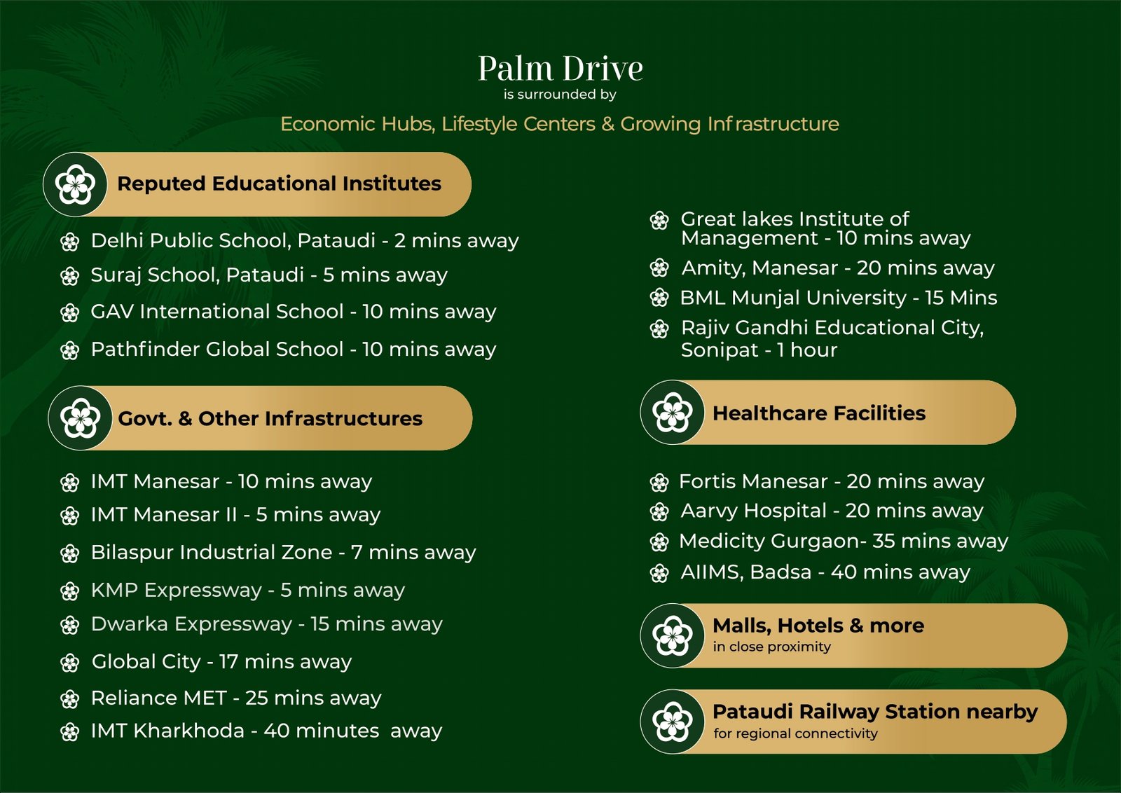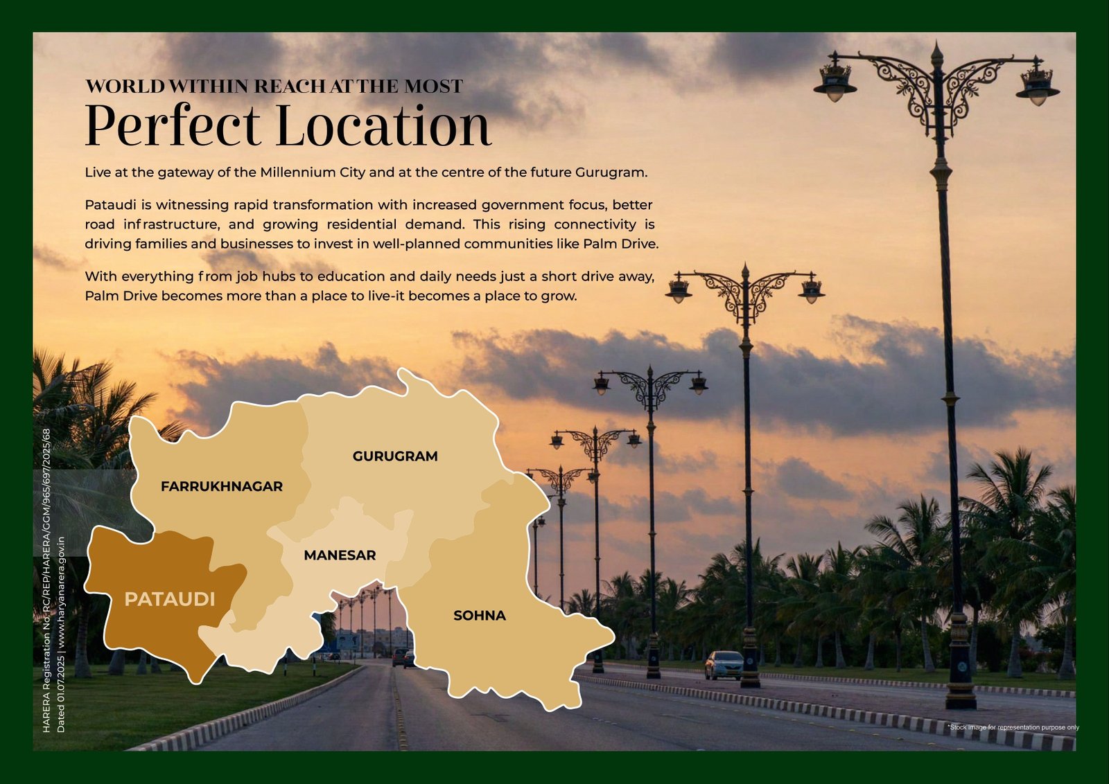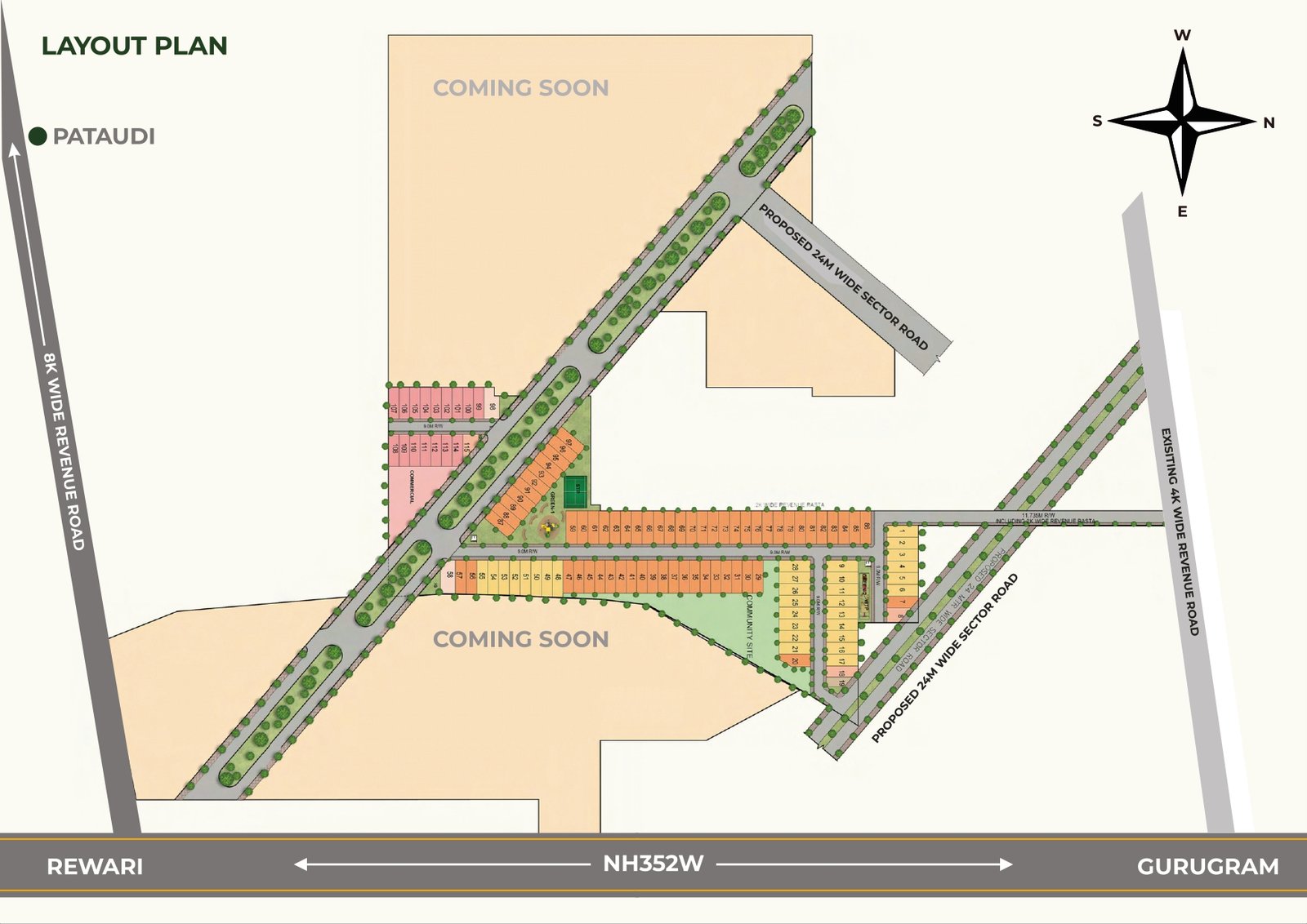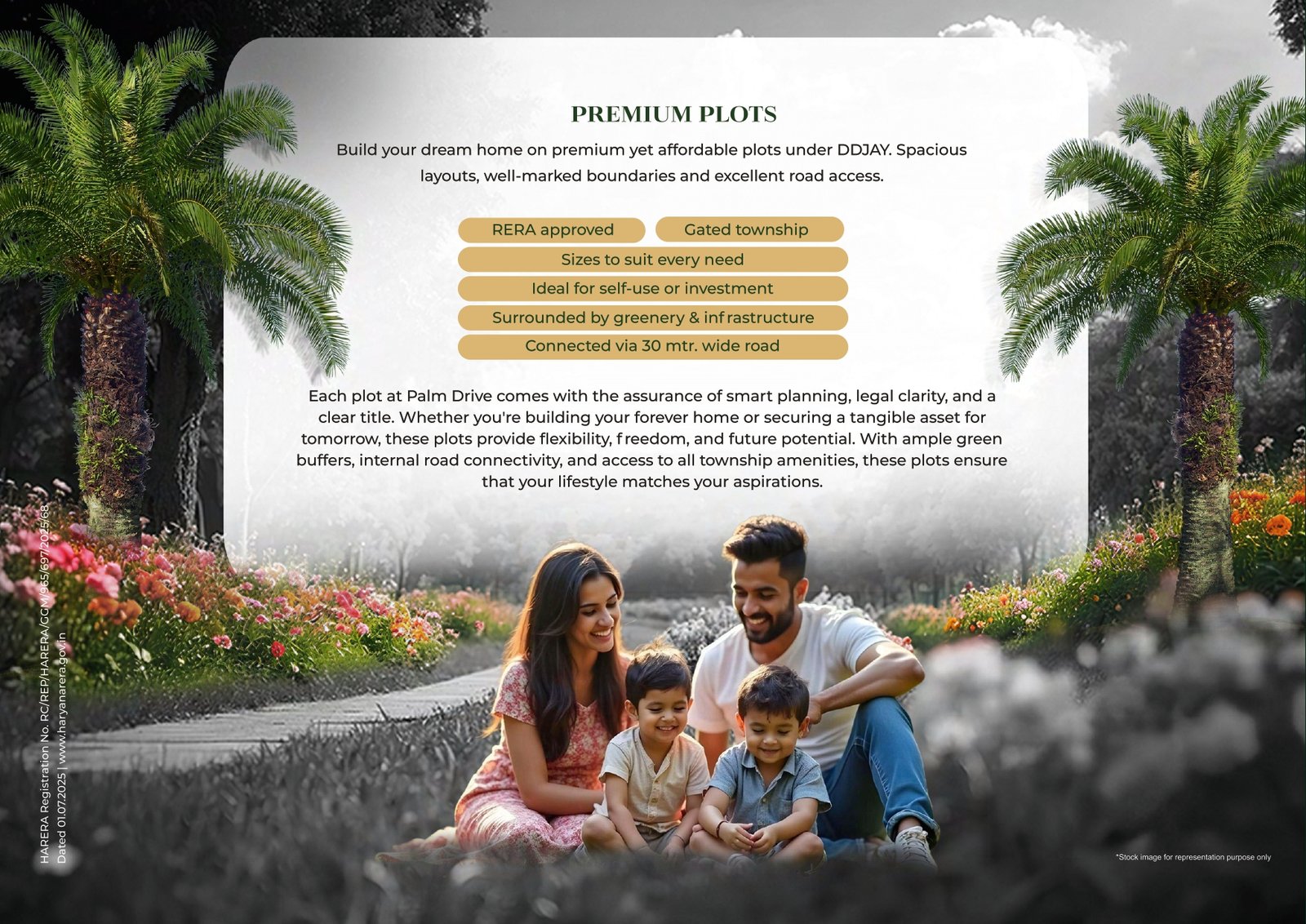 Project Summary: Palm Drive, Sector 3, Pataudi (Gurugram) This project—Palm Drive by VKS Developers—is part of the Haryana government's DDJAY scheme and offers residential plots in Sector 3, Pataudi, Gurugram. Highlights include: Prime Location & Connectivity Adjacent to NH‑352W Only about 3 minutes from KMP Expressway Roughly 10 minutes to NH‑8 (Bilaspur) Around 15 minutes to Dwarka Expressway.