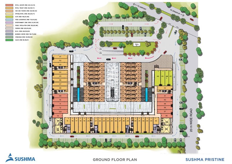 Sushma Pristine, designed by US-based architects R-204, is among the largest business and retail centers being developed on the 200Ft Airport Road (PR-7) in Zirakpur. Covering an expansive 12 lakh square feet, Pristine offers commercial and business spaces strategically located just 10 minutes from Chandigarh International Airport, providing seamless connectivity to Punjab, Delhi, Himachal Pradesh, Haryana, and Chandigarh. This project features commercial and business spaces with exceptional visibility from Airport Road, including a convenient mini-mall for shopping, automobile showrooms, office spaces, retail outlets, fashion boutiques, food and beverage establishments, deck offices, serviced apartments, SOHO, and co-working spaces. First and largest commercial project on Airport Road. High catchment areas include Aerocity, IT City, Infosys, Ashoka University, and more. LEED-certified to maximize value appreciation. High visibility with a large residential catchment area, benefiting from over 10,000 apartments planned nearby. Corner plot location with separate access for service and support staff. Planned gym, steam, and sauna facilities serving up to 12,000 people working within the complex. Double basement and over 700 surface car parking spaces for an enhanced customer experience.