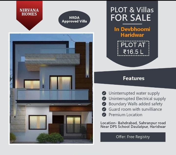 Nirvana Homes – Villas in Bahadrabad, Haridwar by SST Buildtech Pvt. Ltd. Nirvana Homes is a premium residential villa community developed by SST Buildtech Pvt. Ltd., located in the peaceful and well-connected area of Bahadrabad, Haridwar. Offering villas ranging from 720sqft to 1350 sqft, this gated township is designed for those who value peace, luxury, and long-term investment. Spread across 14 acres of fully paid-up land, Nirvana Homes features Ganga-facing plots, providing a rare combination of spiritual serenity and scenic beauty right in front of the society. The project is HRDA and RERA approved, ensuring complete legal transparency and secure investment potential. It is seamlessly connected to NH-58 and just a 15-minute drive from the iconic Har-ki-Pauri, making it both spiritually significant and easily accessible. Within the township, residents benefit from wide 40 ft main roads and 30 ft internal roads that add to the sense of space and convenience. Nirvana Homes offers world-class amenities tailored for a holistic lifestyle—24/7 security with CCTV surveillance, a yoga pavilion, a beautifully designed temple for spiritual connection, a children’s play area, and lush green landscaped spaces perfect for relaxation. Whether you're planning to build your dream home or invest in a high-growth location, Nirvana Homes delivers the perfect balance of luxury, convenience, and tranquility in one of Haridwar’s most desirable neighborhoods.